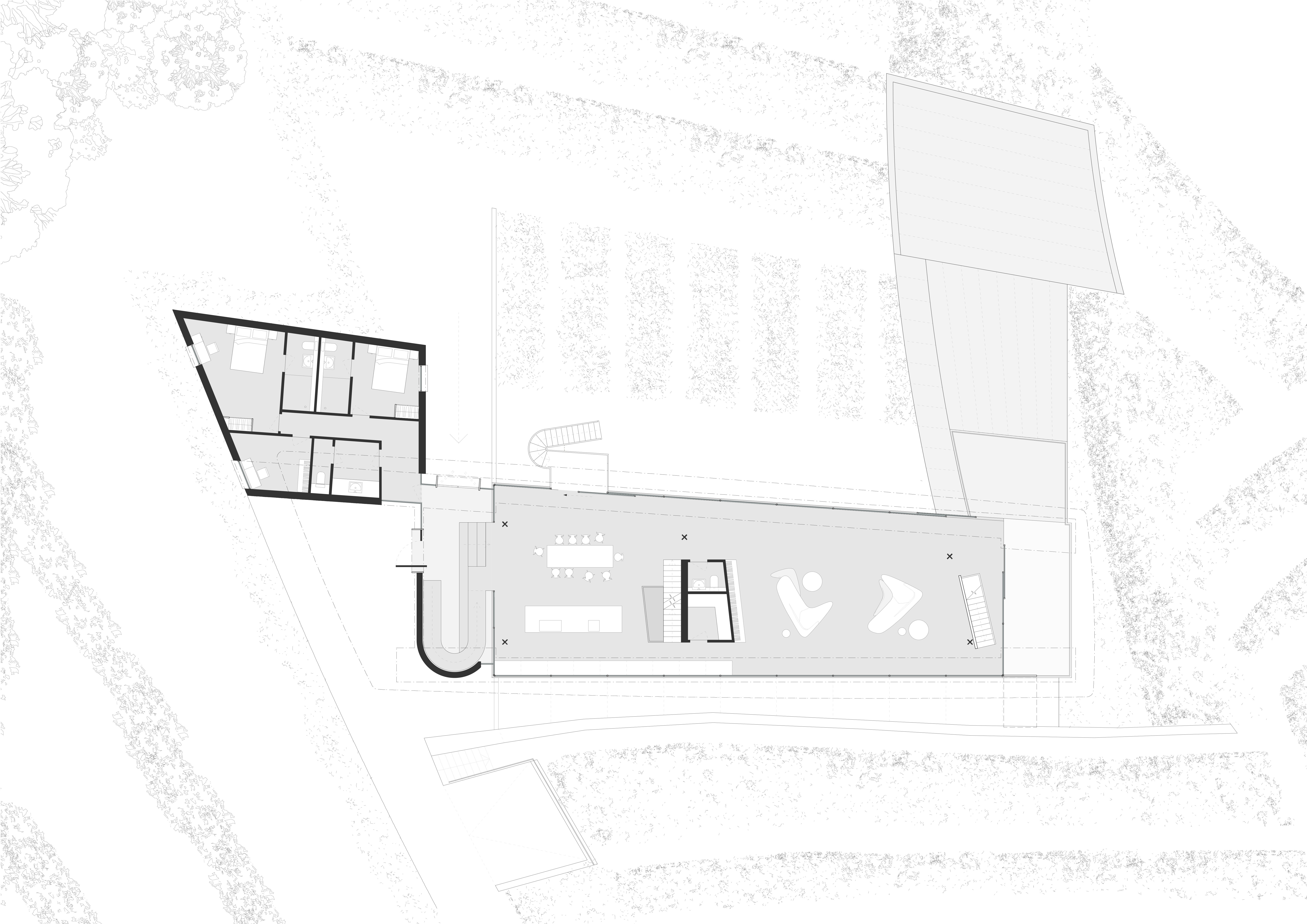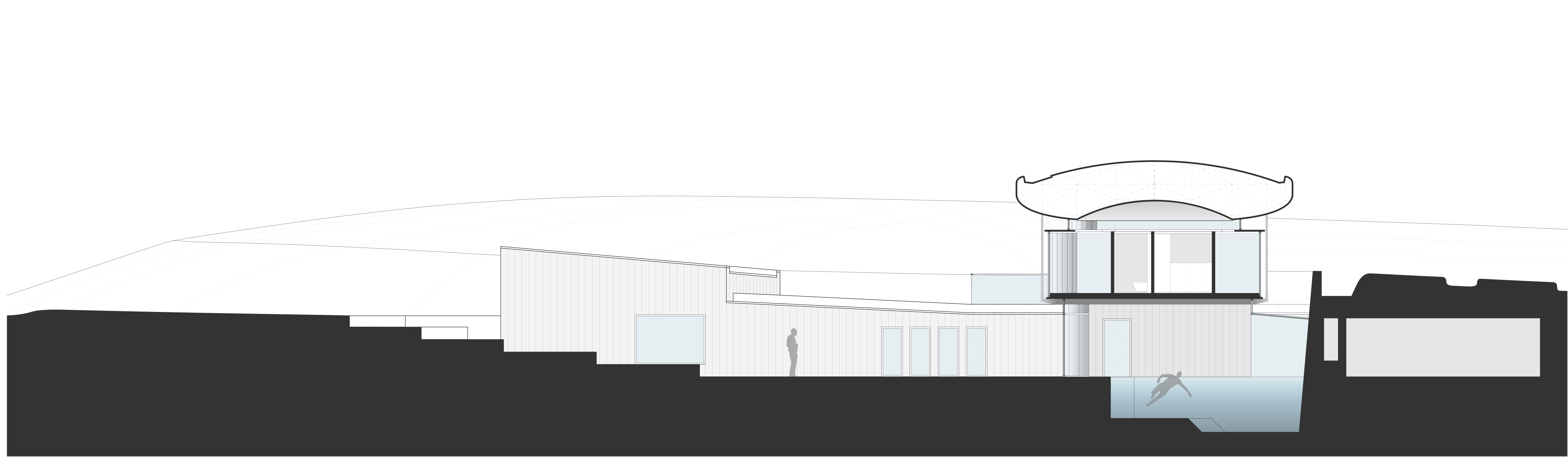 The house is simply arranged under the dominant roof as a living platform, with perimeter glazing, suspended over a ground level pool. An existing listed thatched cricket pavilion on the edge of the site will be restored and its numerous existing inappropriate extensions will be demolished and replaced by a single small elegant addition. There will be a viewing tower amongst trees at the edge of the site which will be open on four weekends each year for members of the public to be able to see the entire land art project from the centre of its perspective geometry.