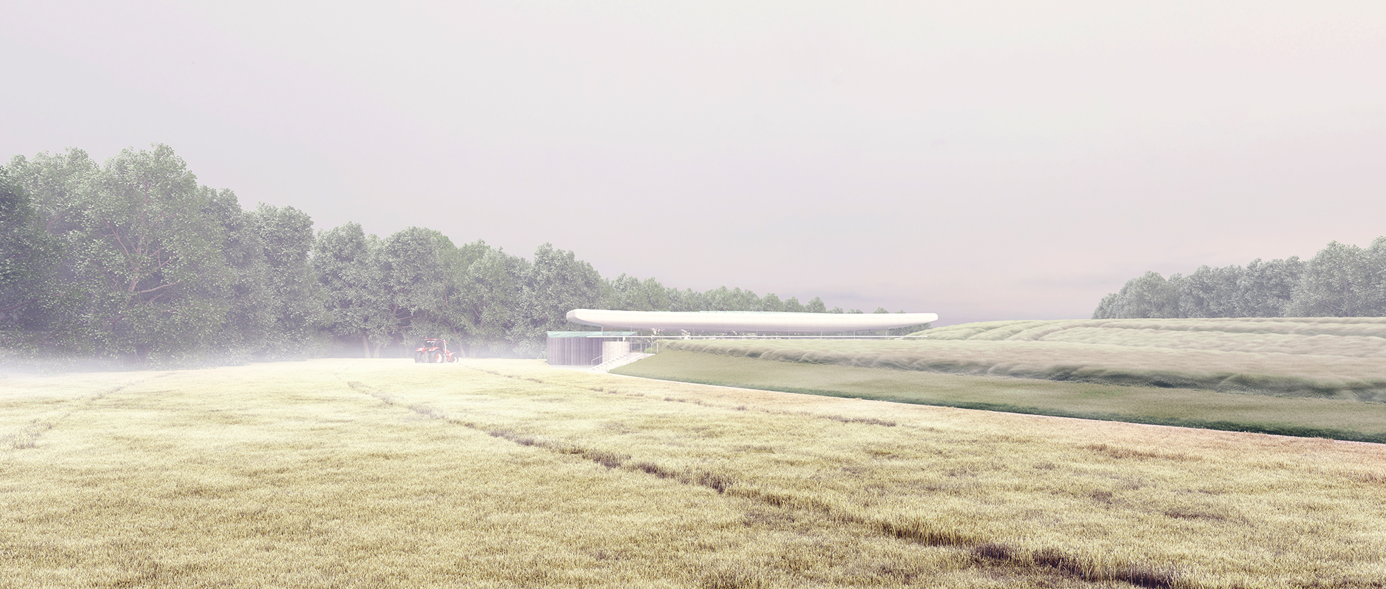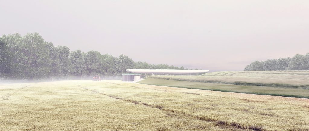 The permission was granted under paragraph 55 legislation for a house and landart in a large plot of land in a village on the outskirts of Huntingdon. The site will be sculpted with waves of grass and ridges of earth reminiscent of ridge and furrow agriculture. In its centre rises a large mound on which Whiteford has created a white land drawing. The house is folded into this extraordinary landscape and its long white roof floats over the land drawing as the culmination of a series of white lines, recalling the feathers of a bird’s wing, that Whiteford has etched into the surface of the mound.