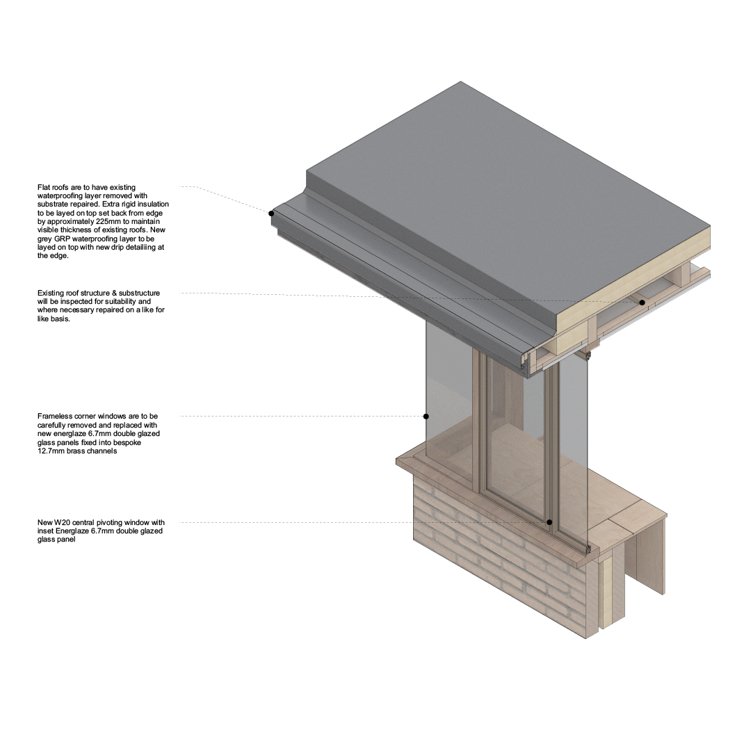 The existing single-glazed windows are proposed to be refurbished with new Fineo integrated glazing units that were able to fit into the existing minimal frames while improving thermal performance significantly. This coupled with new modern insulation on the flat roofs and walls will make the house more thermally efficient and therefore environmentally sustainable while preserving the special architectural character of this listed building.