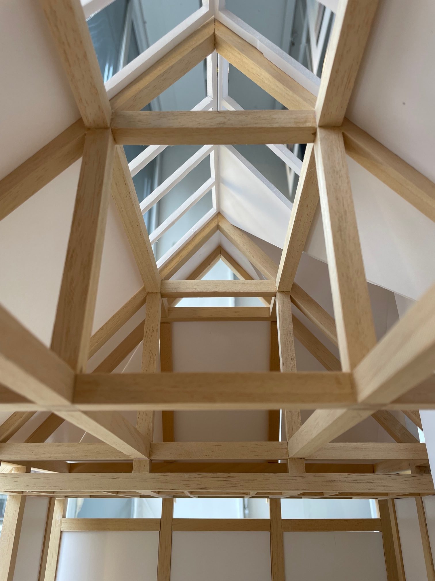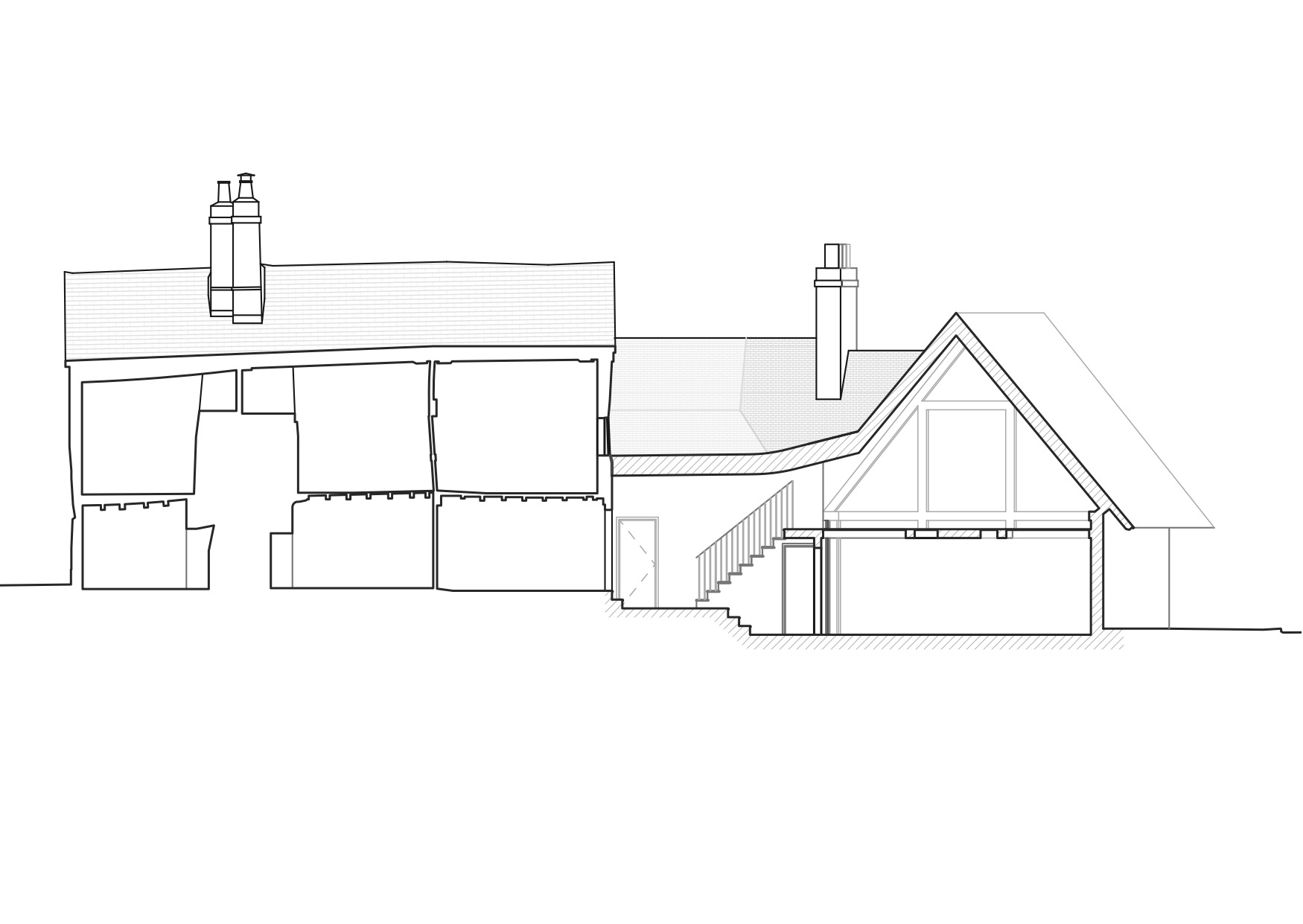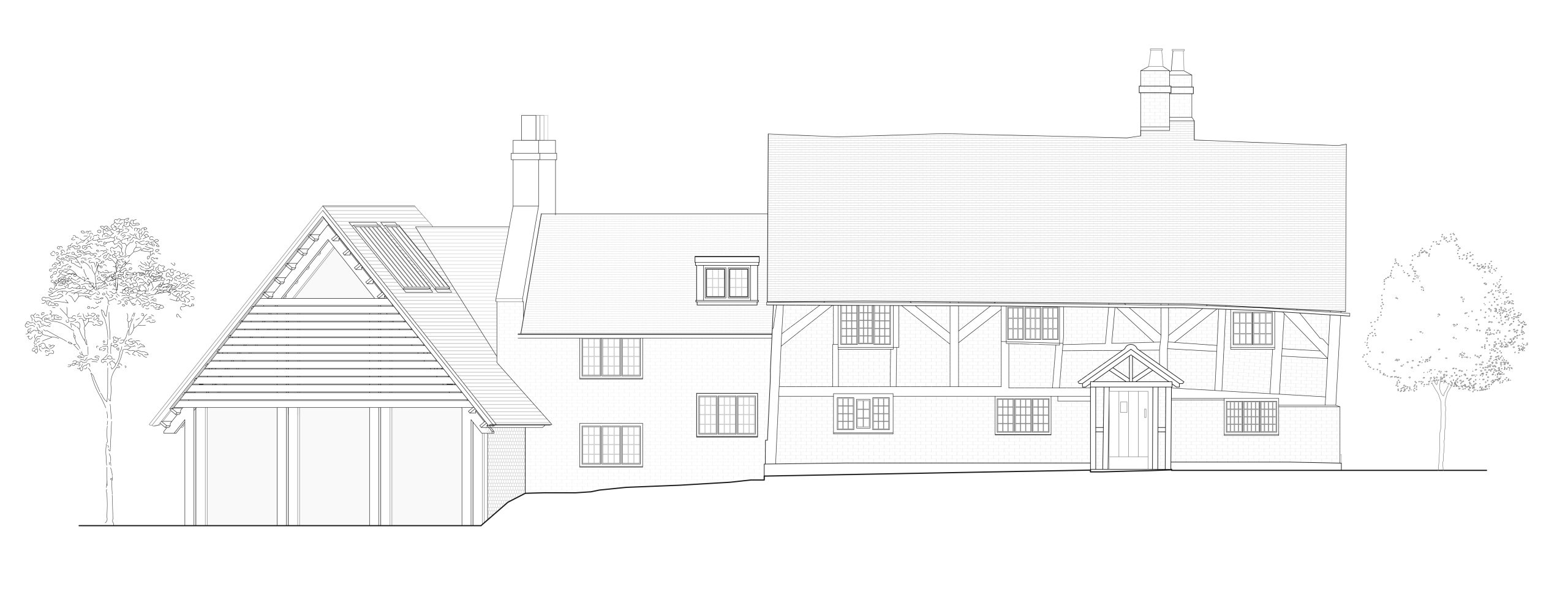 The existing building, while of high architectural and historic value, has very poor thermal performance and low levels of light and tight, cramped spaces. Our extension, which is comprised of two distinct ‘wings’, provides a relief from these smaller spaces and a far higher standard of environmental performance. The intention is that the large ‘barn’ space is bridged to the original house by an intermediary, semi-historical extension which was carefully negotiated in terms of heights and style with the planning authority, aided by our heritage consultant Jon Lowe Heritage.