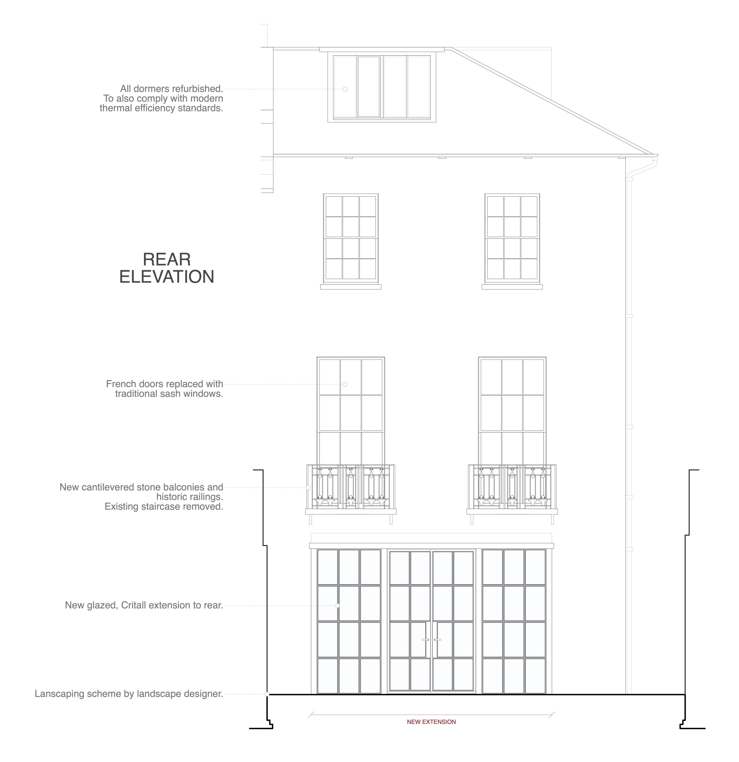To the rear we have designed a minimal, glazed extension to provide greater permeability between the indoor and outdoor spaces. Working with Jonathan Bell Studios, the garden is also to be substantially reconfigured including water features, natural stone surfacing, and planting.