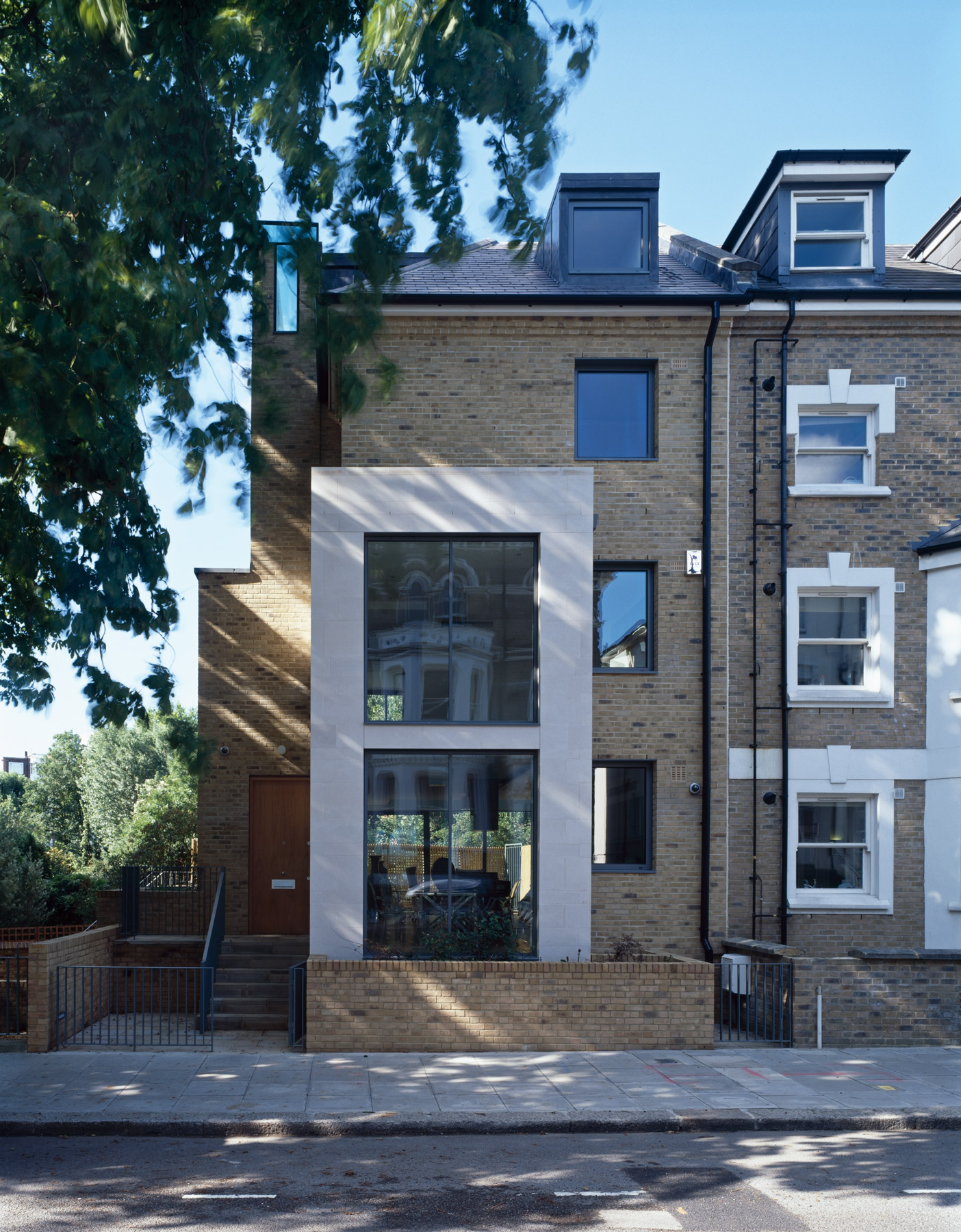 The site was a car park at the end of a row of undistinguished 1980s terrace houses. Nonetheless it was within a designated Conservation Area and we had to demonstrate that the design fitted in, both in form and materials, with the prevalent local type of late Victorian bay-fronted houses. While this gave us a somewhat sober street facade, the exposed flank of the building allowed a more inventive use of brick, following some lovely local examples of Edwardian rubbed red brickwork, and the possibility of a side- and top-lit staircase.