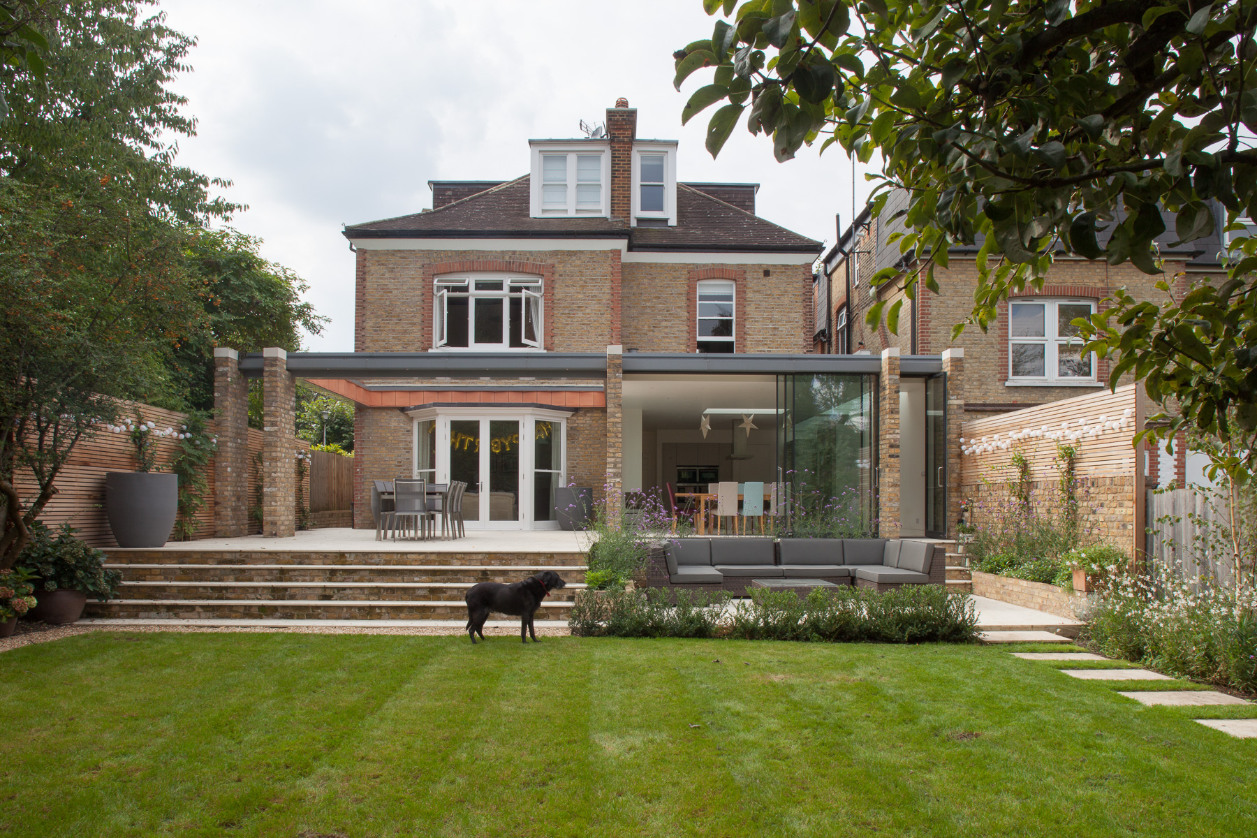 A line of tall brick piers define a permeable boundary between house and garden, creating a semi-enclosed courtyard placed between the contemporary new elements, the dining room and kitchen, and the original Edwardian house behind. Broad steps lead from the courtyard and terrace down to the lawn.