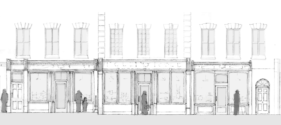 As specialist design consultants we designed three shopfronts for a restaurant, delicatessen and flats project in Charlotte Street, Fitzrovia.