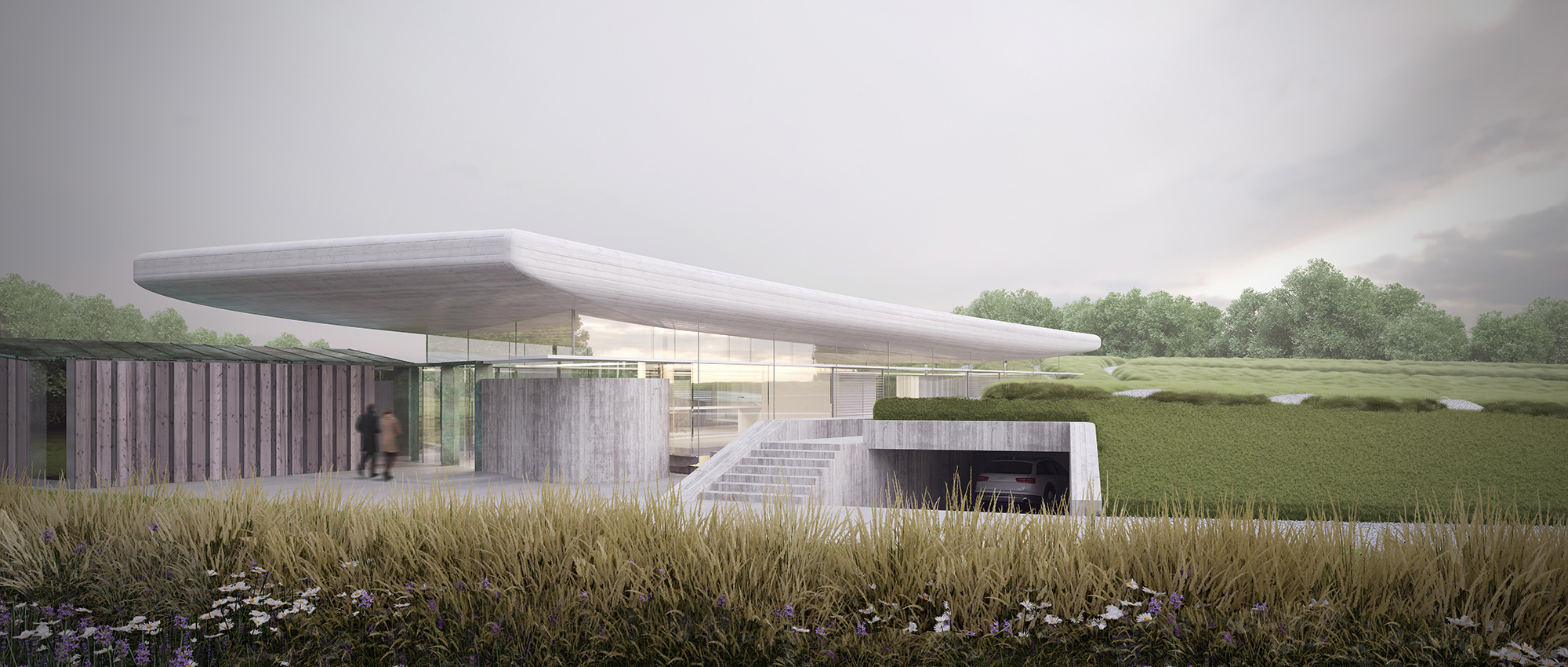 The house is simply arranged under the dominant roof as a living platform, with perimeter glazing, suspended over a ground level pool. An existing listed thatched cricket pavilion on the edge of the site will be restored and its numerous existing inappropriate extensions will be demolished and replaced by a single small elegant addition. There will be a viewing tower amongst trees at the edge of the site which will be open on four weekends each year for members of the public to be able to see the entire land art project from the centre of its perspective geometry.